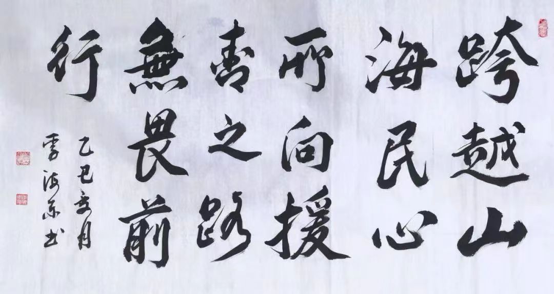 在黄南藏族自治州笔会现场,两地书法家联手写下“津青两地一家亲”,黄南州书法家协会常务副主席兼秘书长李海东写出“千里援青路,山海共情深”和“跨越山海、民心所向、援青之路,无畏前行”气势磅礴和以墨传情的书法作品,表达津黄两地的深厚情谊。天津市群众艺术馆业务干部姚铸现场创作松、竹、梅等国画作品,赢得赞叹。黄南州书法家协会的藏族书法家南卡仁青创作的藏文书法作品字体飘逸秀美,他介绍:“藏文书法也有多种字体,书写方式各有特色。书法需要潜心研究,能够磨炼耐心和毅力。