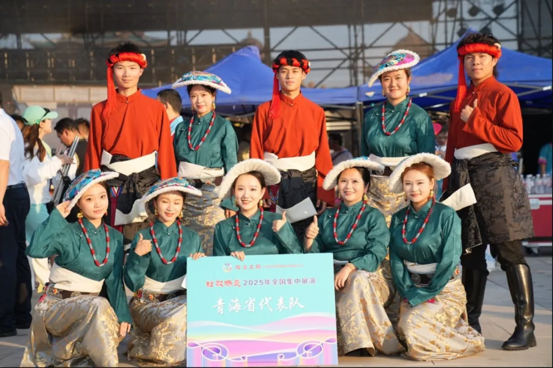 图为“村歌嘹亮”2025年全国集中展演开幕式现场青海代表队合影。鄂尔多斯市融媒体中心供图。